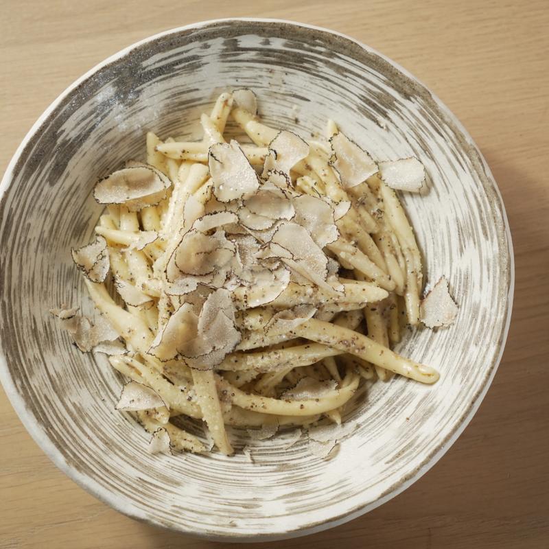 Homemade fresh pasta, fresh seasonal black truffles, Parmesan cheese