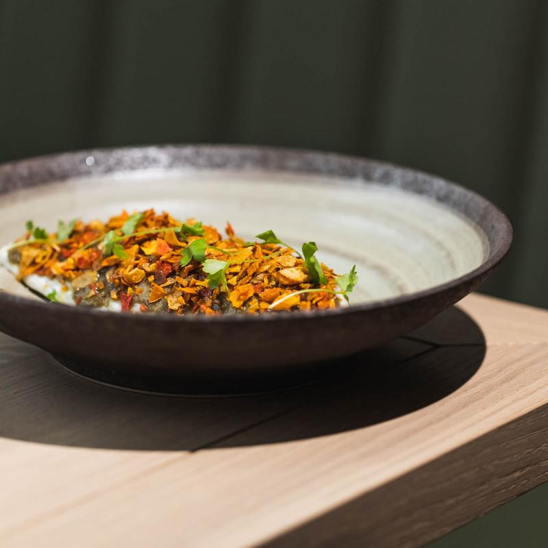 Marinated in spicy yogurt, parsnip, kale, Cipollini onions, sherry chicken jus