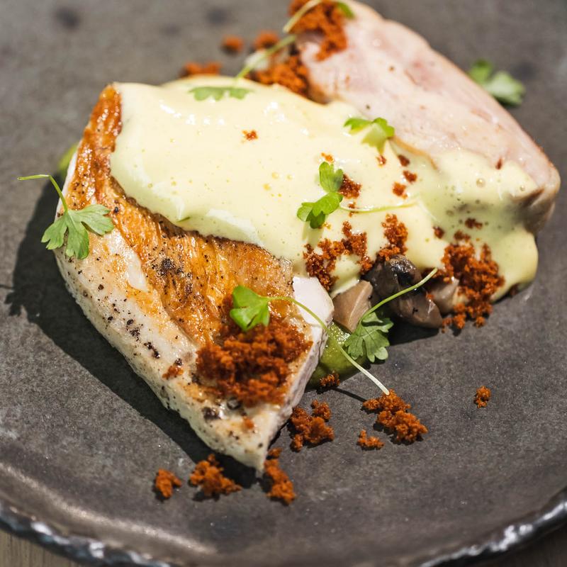 Pan-seared cod, baby bok choy, pea leaves, royal trumpet mushrooms, carrots & celery veloute, Jimmy Nardello peppers, giardiniera vinaigrette